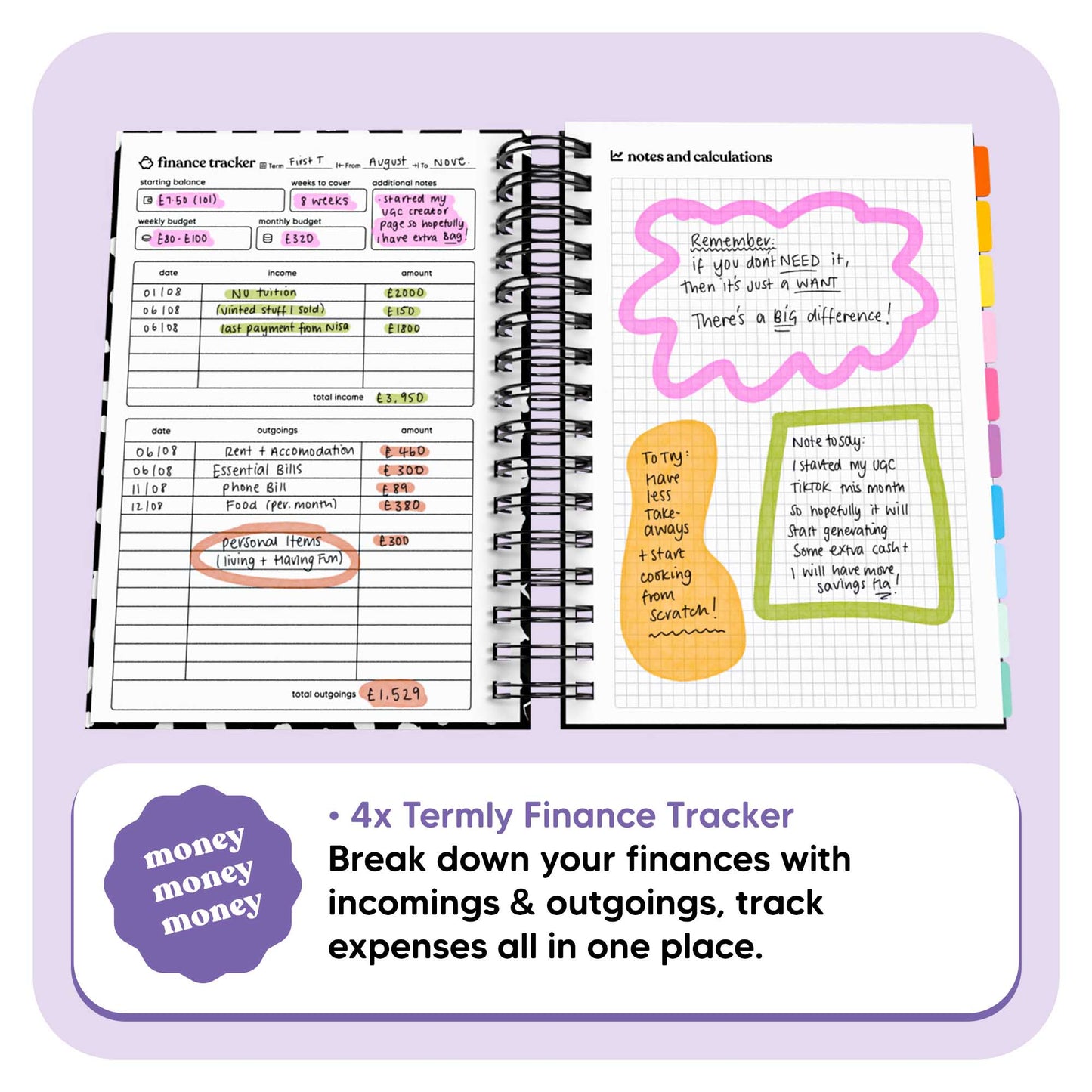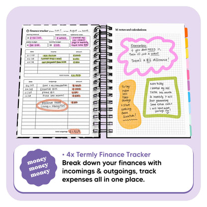 Don't let your finances run you, instead, track your incomings & outgoings in the included Finance Tracker. With a handy "Notes & Calculations" page, you can write down notes, reminders, or graphs.