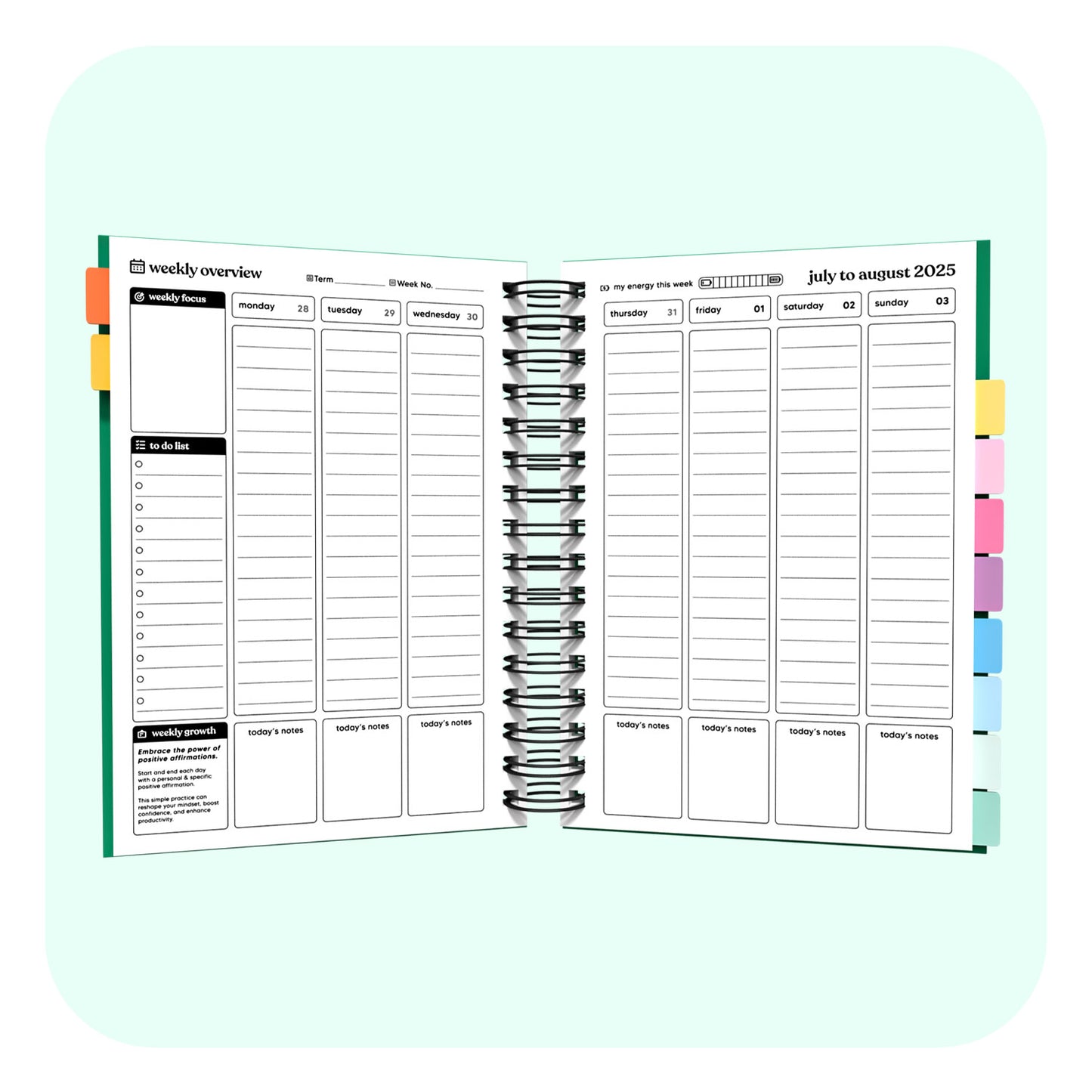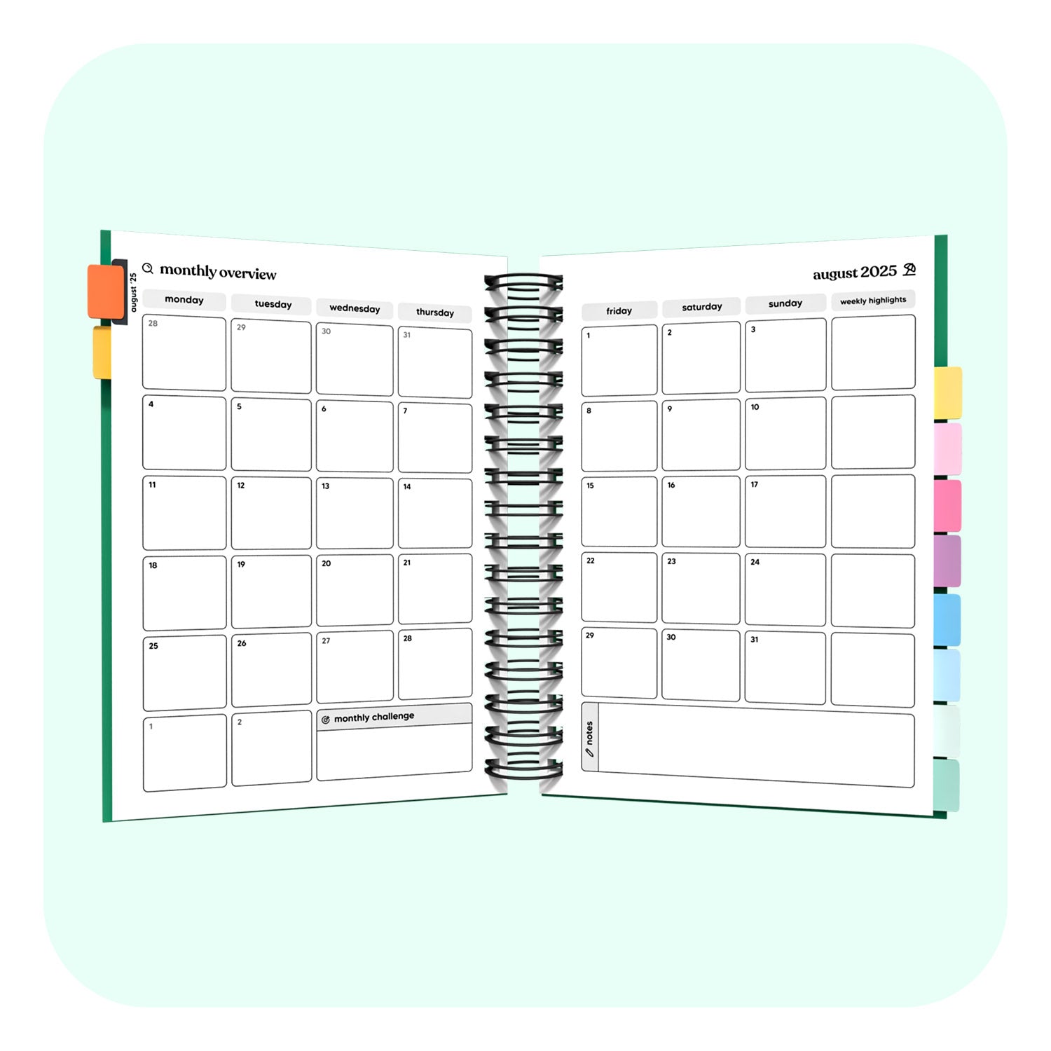 - Monthly Overviews plan your entire month in one double page spread.