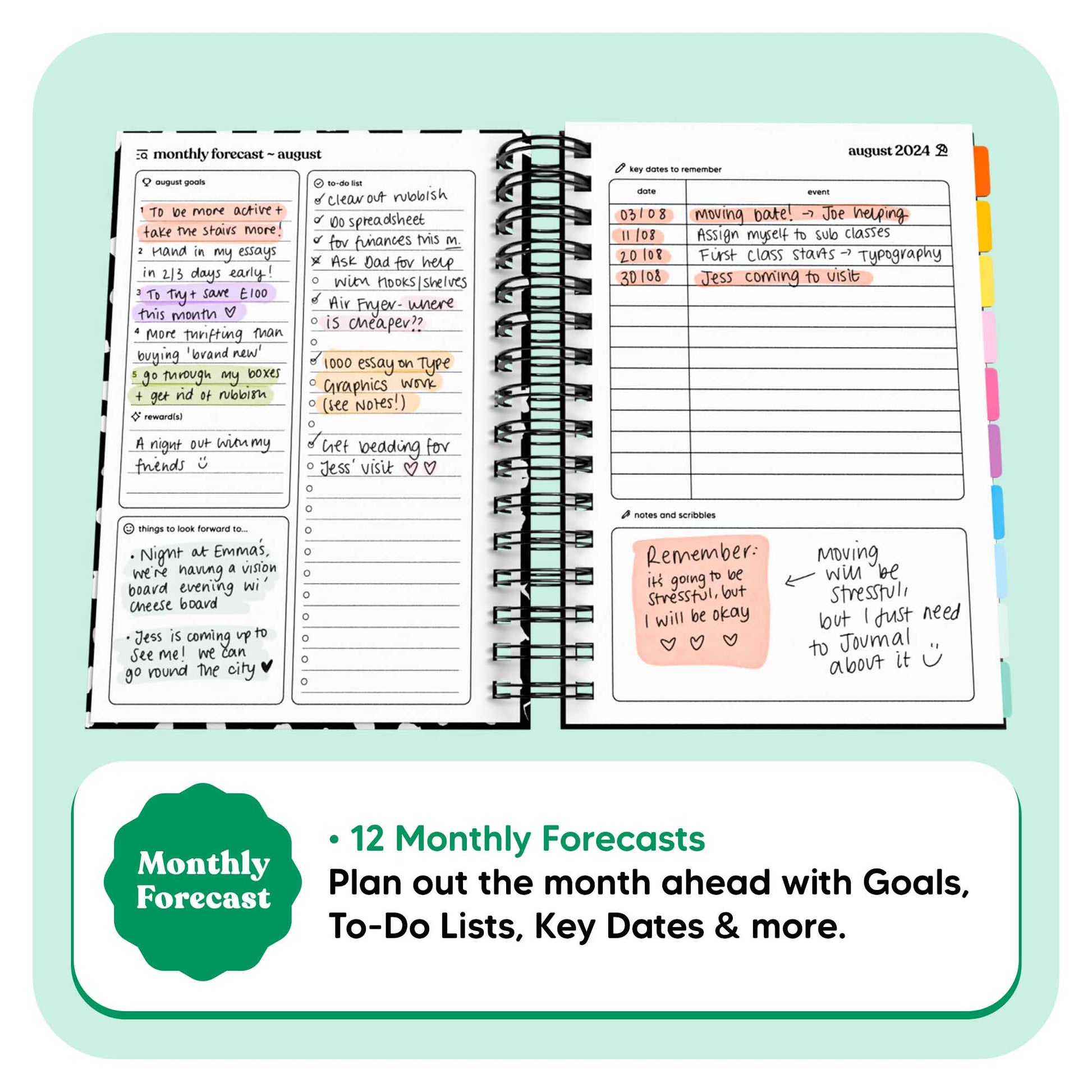 Take a moment to plan ahead for each month with the "Monthly Forecast". Write down your To-Do's, Goals, Important Dates and more.