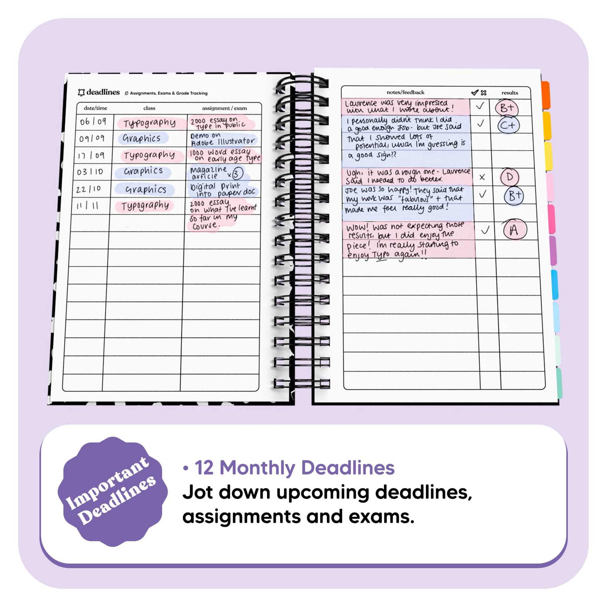 A dedicated space to track your longterm deadlines, and assignments. Record your results and any additional notes.
