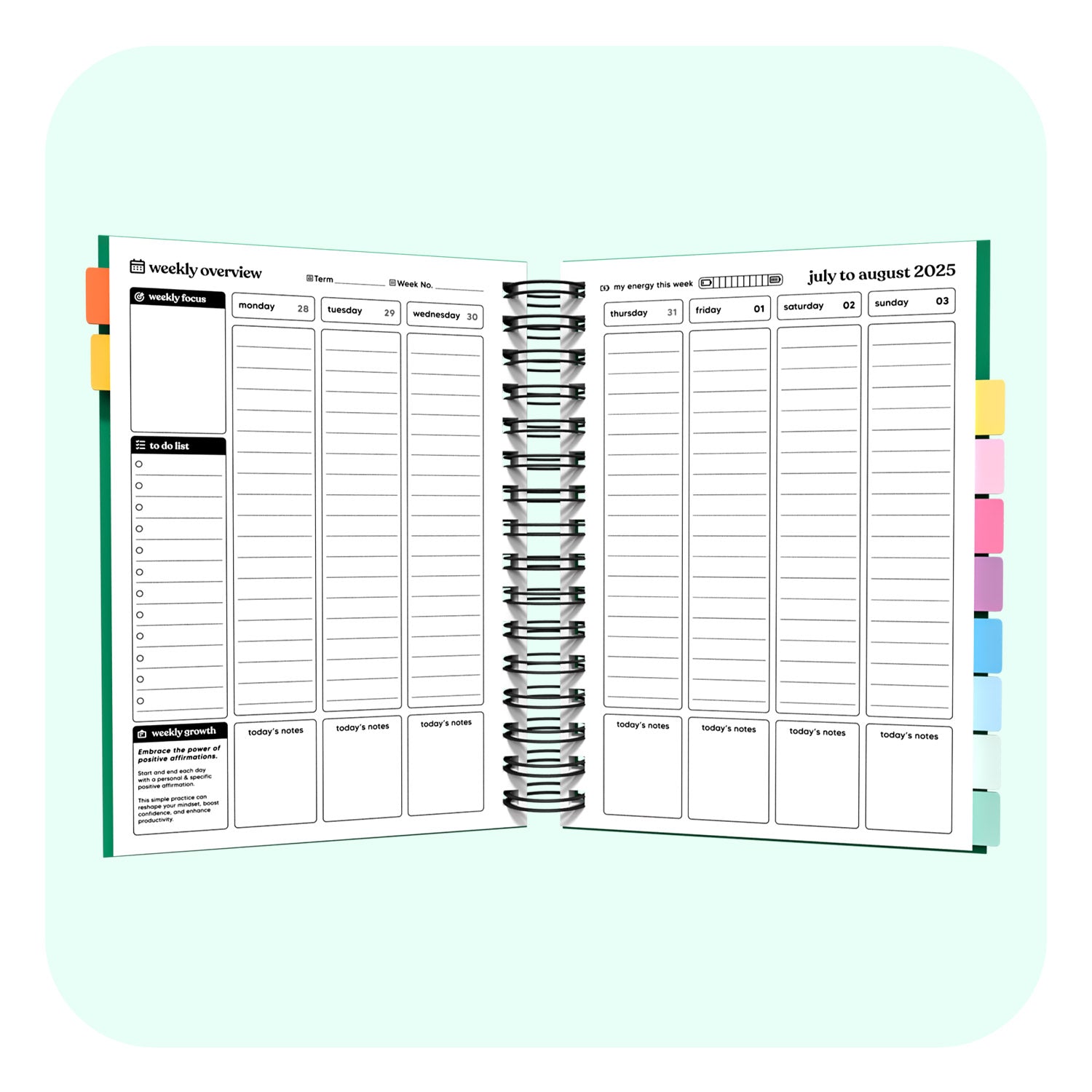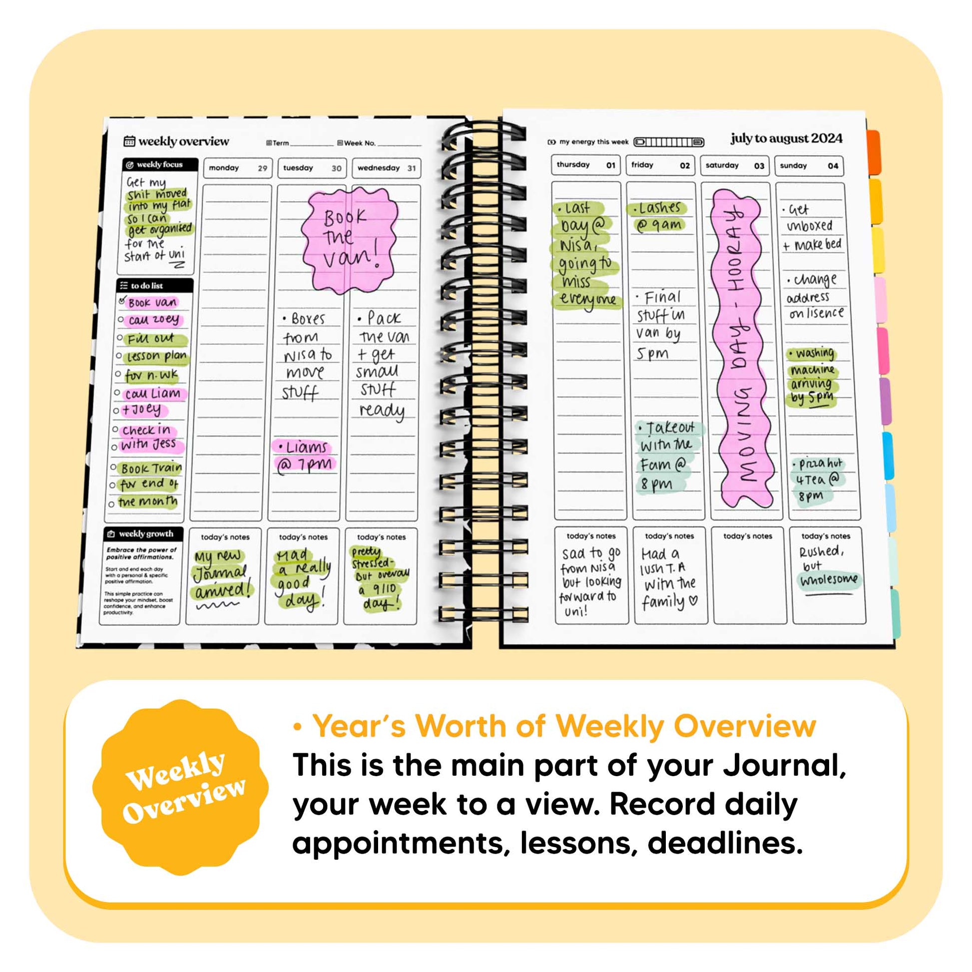 - Weekly Overviews plan out your week with daily blocks, to-do's, and more.
