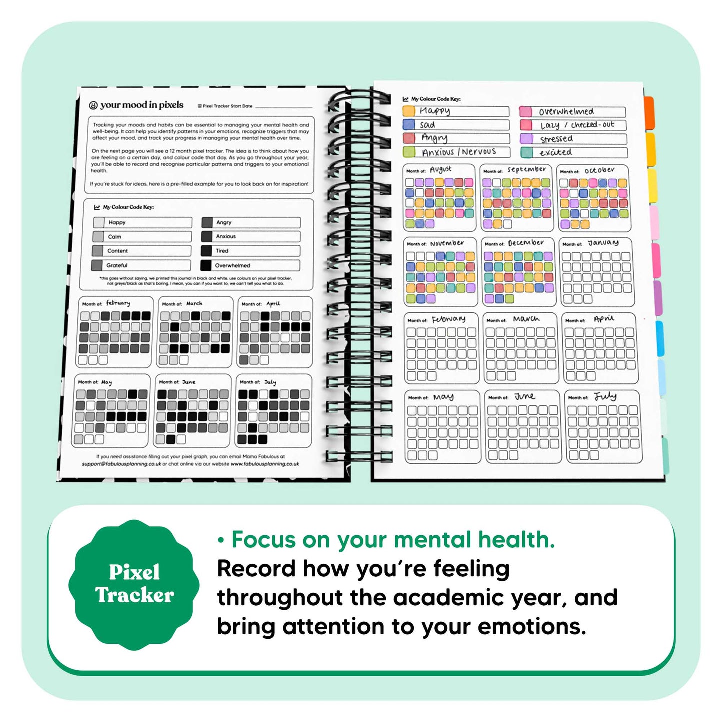 Shine a light on your mental health with the included Pixel Tracker. Record your emotions & moods, highs and lows. Look back on your year and see where you could use an extra day of self care.