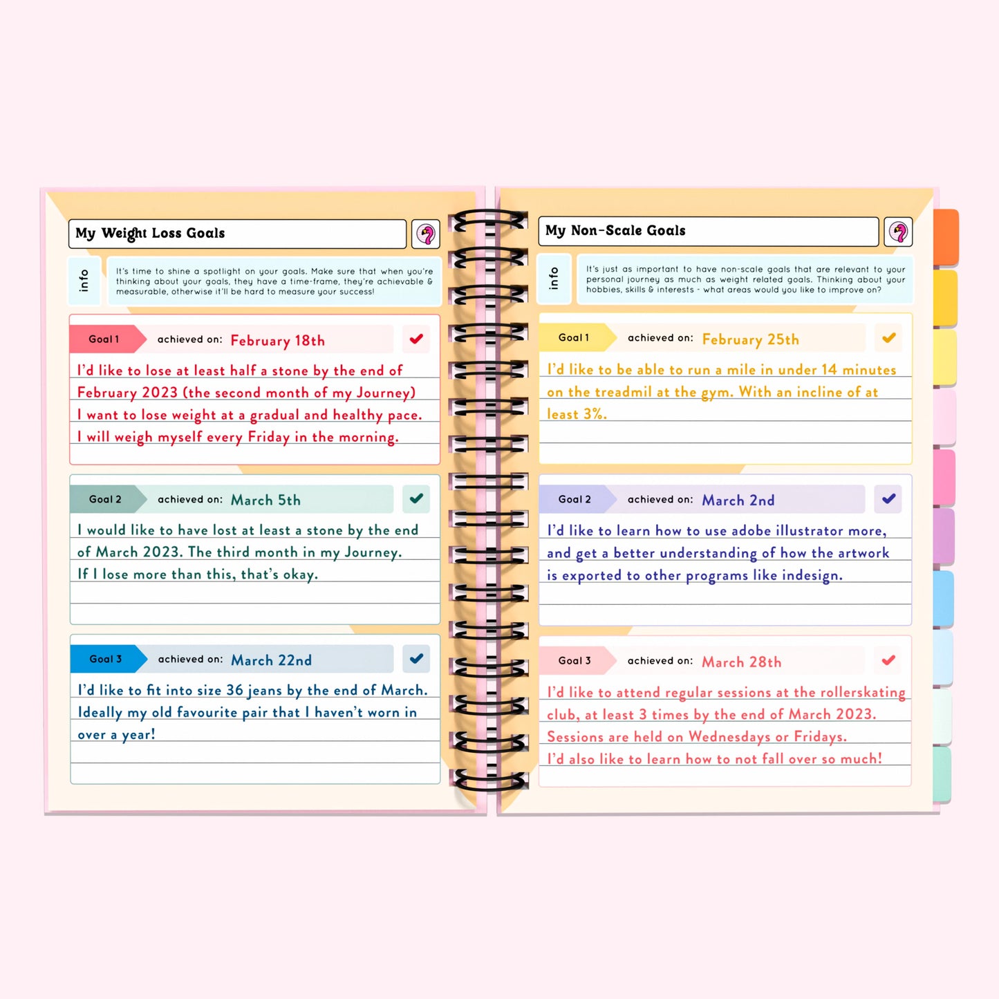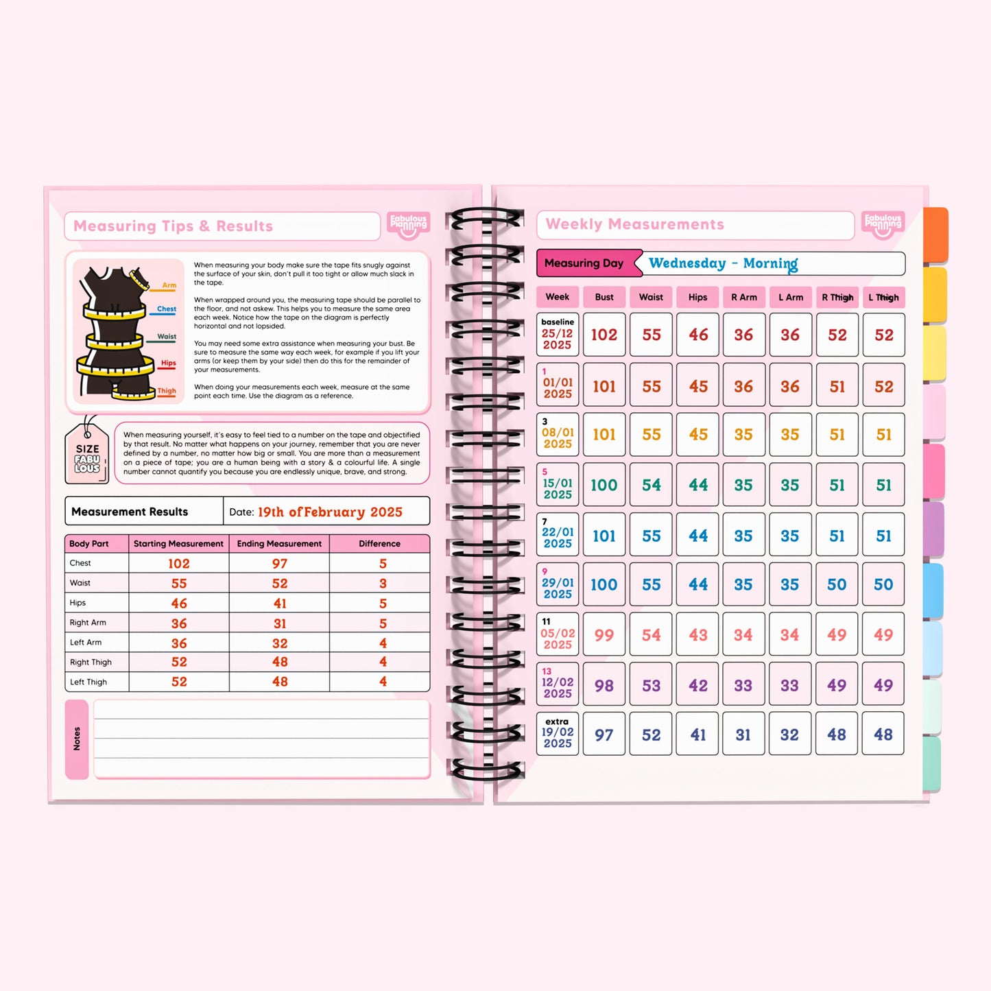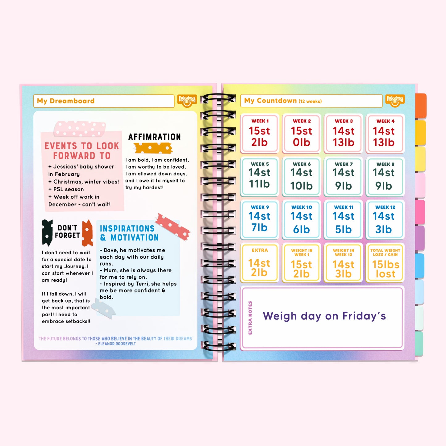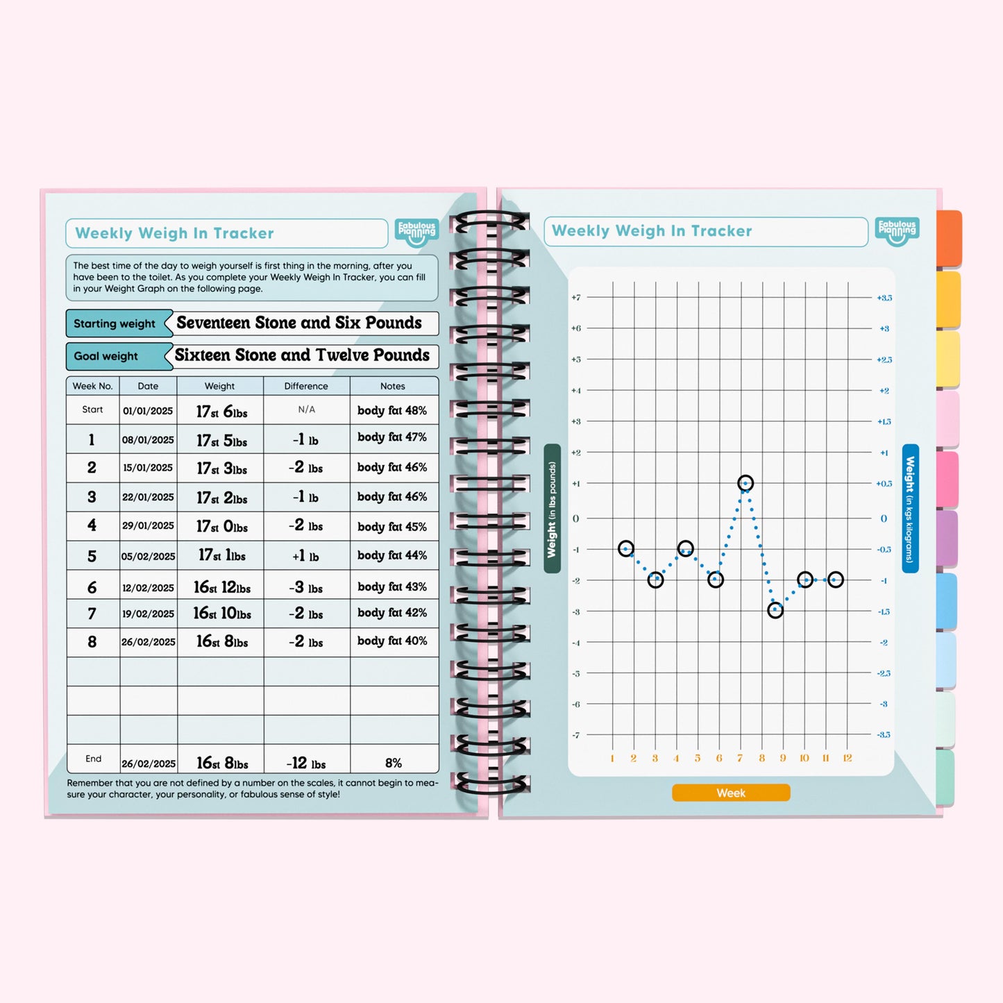 After completing the included Weekly Weigh In, you can visualise your journey into a colourful bar graph.